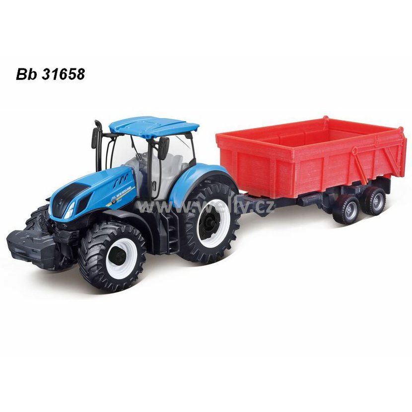 Kovový model traktoru se setrvačníkem, bez uvedení měřítka New Holland T7.315 with Tipping Trailer (řada cca 10 cm + vlek 13 cm) - code Bburago 18-31658, Farm. Nevhodné pro děti do 3 let.