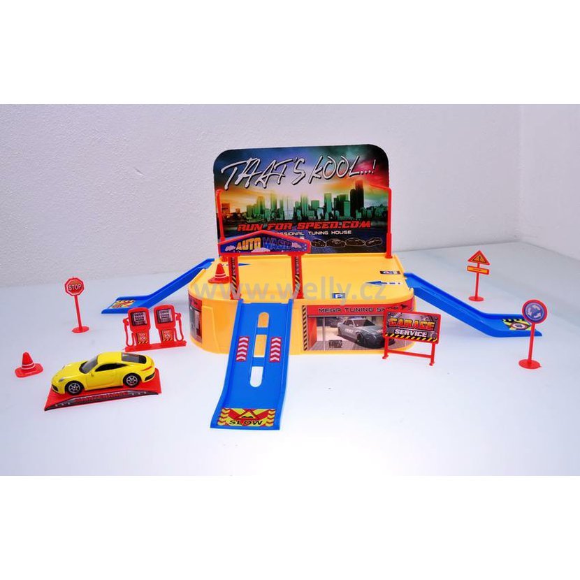 Balení obsahuje skládací garáž, tankovací pumpu, nájezdy, značky... Všechny díly si polepí samolepkami, které jsou součástí balení. Balení obsahuje i auto Welly Porsche. Baleno v papírové krabičce. Délka cm.